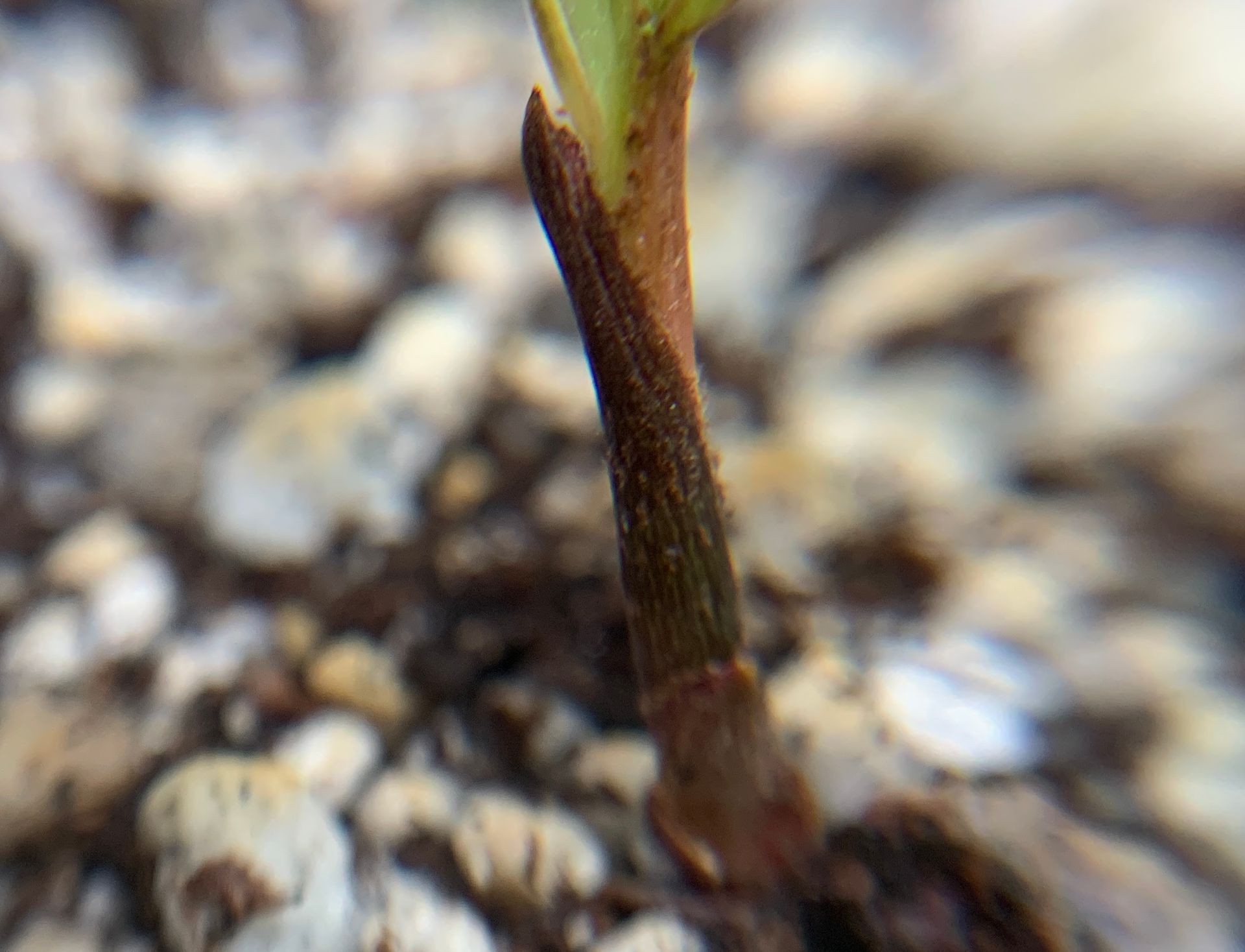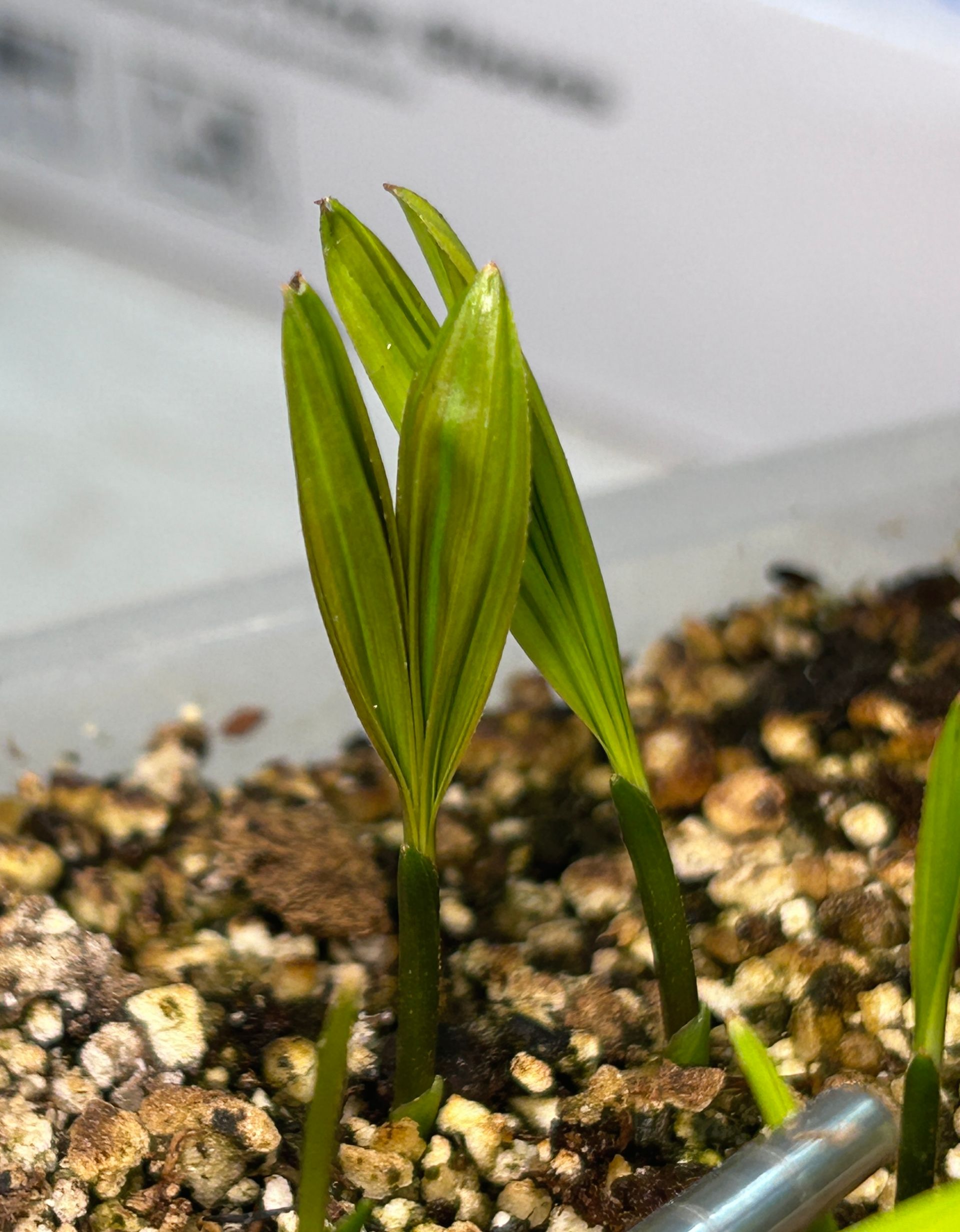 Identification: The first few leaves of seedlings typically have a bit of reddish/fuzzy characteristics from the Teddybear father and appear bifid but with tiny windows in the leaflets. (Consider: pure Cabada Palm has a bifid eophyll while pure Teddybear Palm has a pinnate eophyll so this is a mix of the two different types).