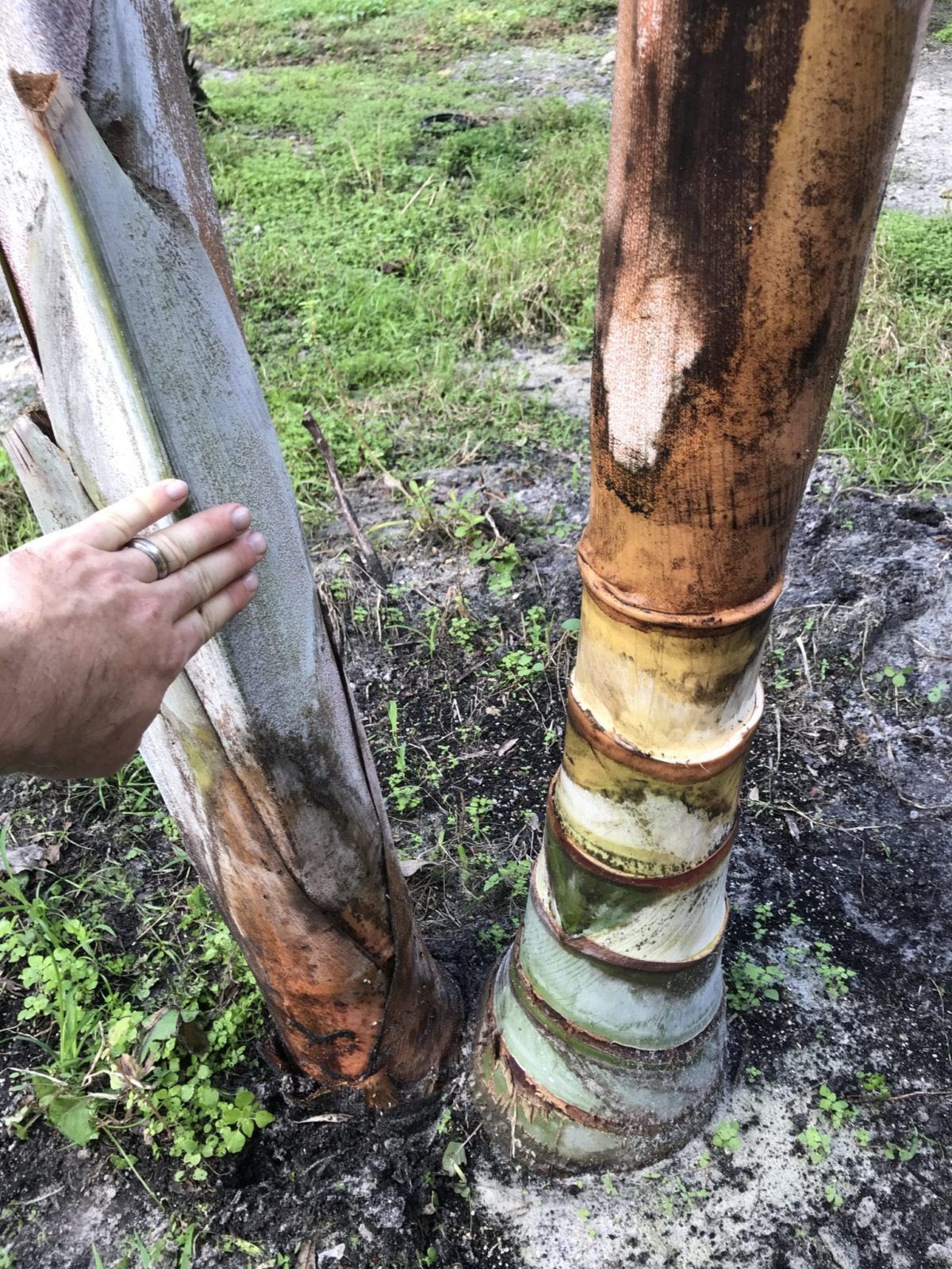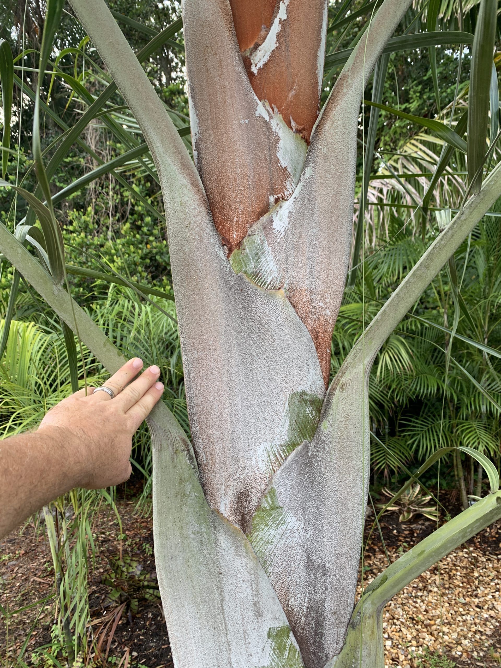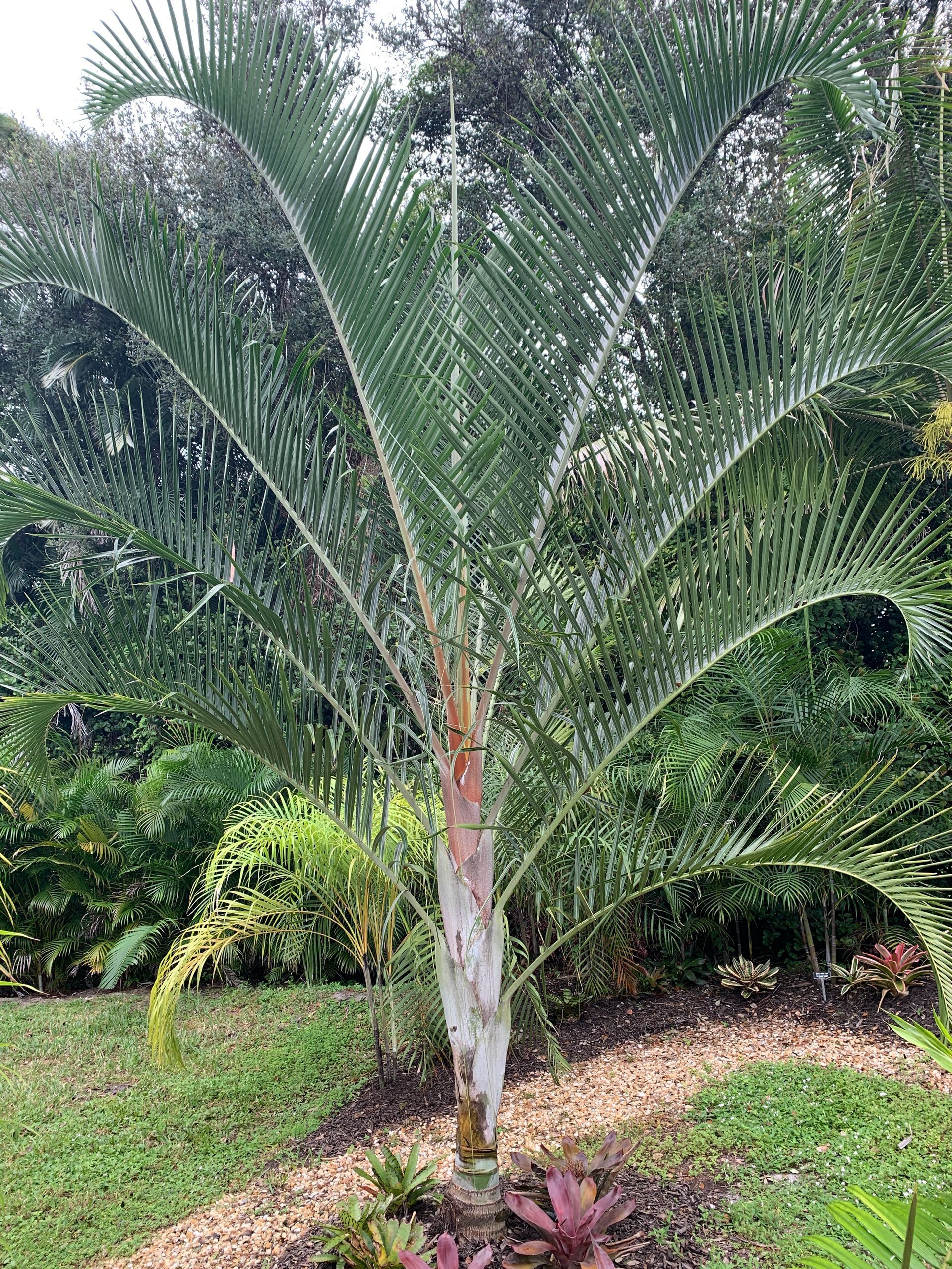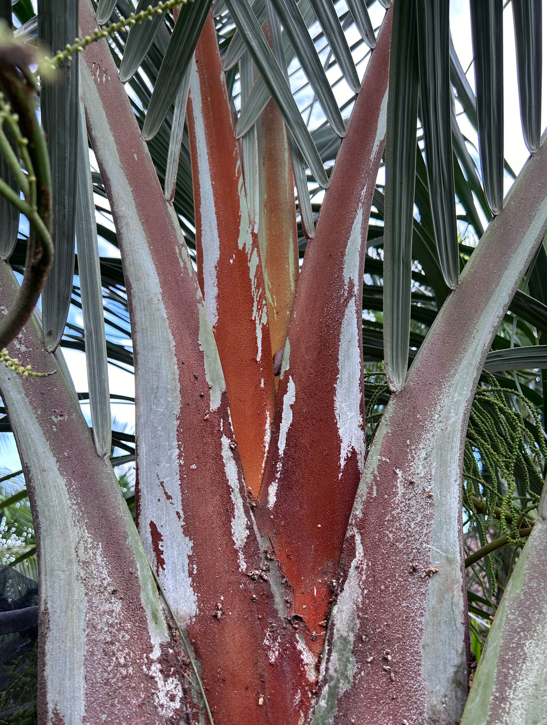 Benefits: This hybrid should be able to take a few more degrees of cold than the pure Chrysalidocarpus pembana. As a young palm, the hybrid is slightly slower growing than pure Chrysalidocarpus pembana, but speeds up quite a bit when older, the fronds are a bit more silver and upright, and also seem more resistant to spotting and yellowing than the pure mother plant. Also, the hybrid tends to split a couple times, producing two or more trunks, whereas the pure species produces new young stolons (stems) from the base. This hybrid is a pretty palm with a tristichous (vertical rows of three) leaf arrangement, elongated crown shaft, and an emerald-green trunk that is reminiscent of bamboo.