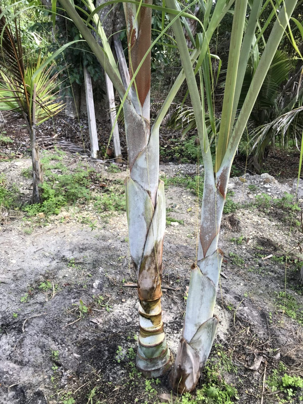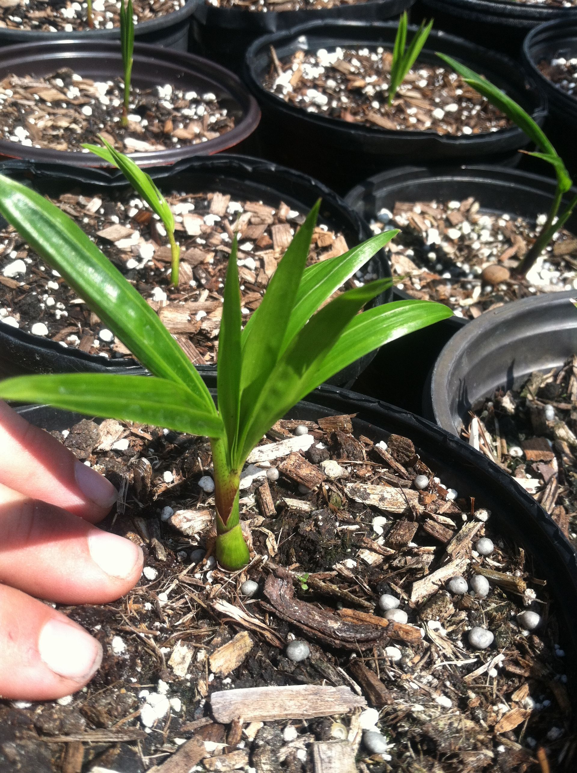 Identification: Prophyll (first spike/tube) is typically very short- about ¼” or so and colored differently than the eophyll (first leaf). Eophyll is dark, emerald green and very stiff and upright (unlike pure palm which is lime-green and rabbit-eared). Hybrid seedlings are also noticeably slower growing than pure Chrysalidocarpus pembana.