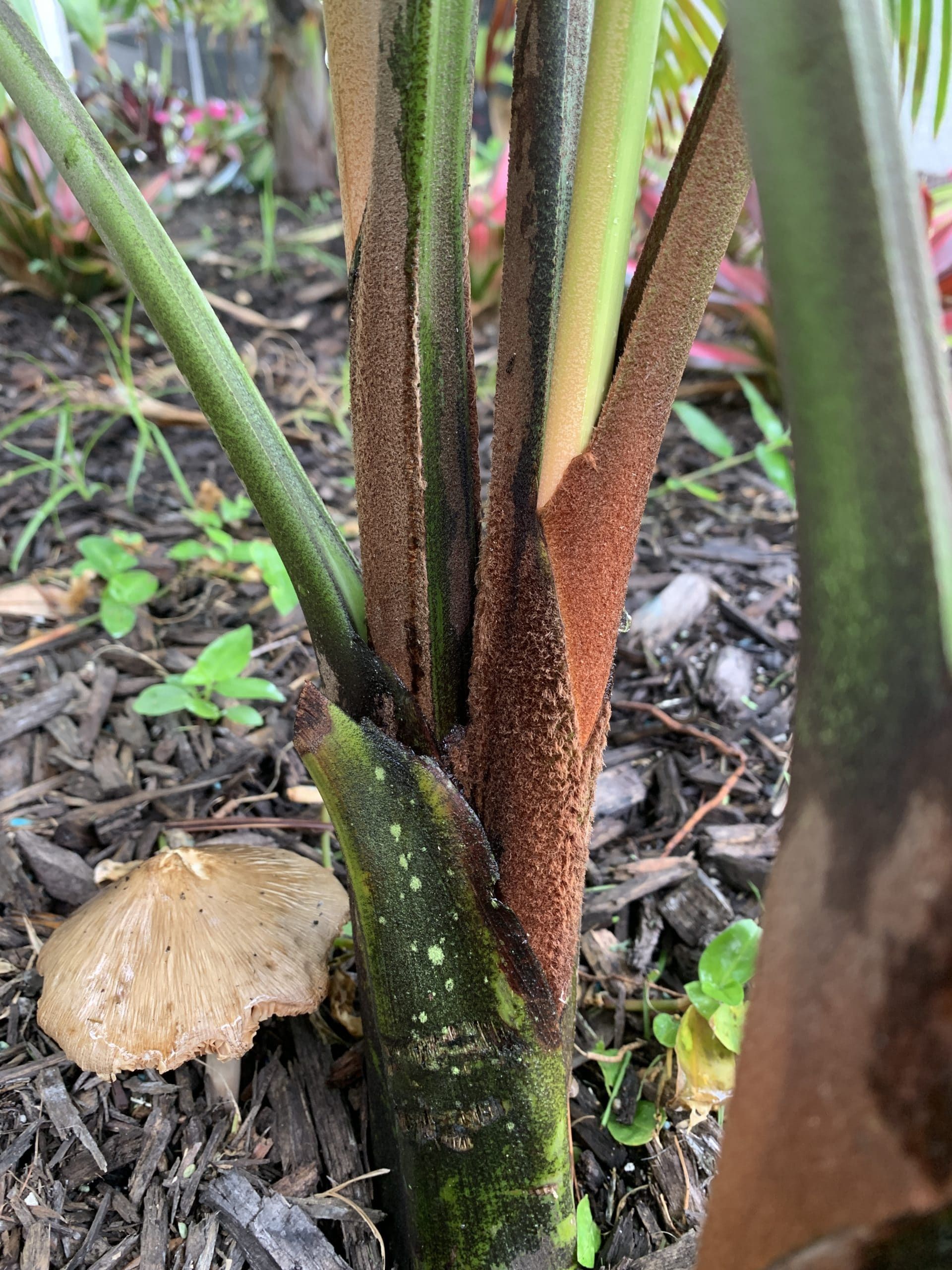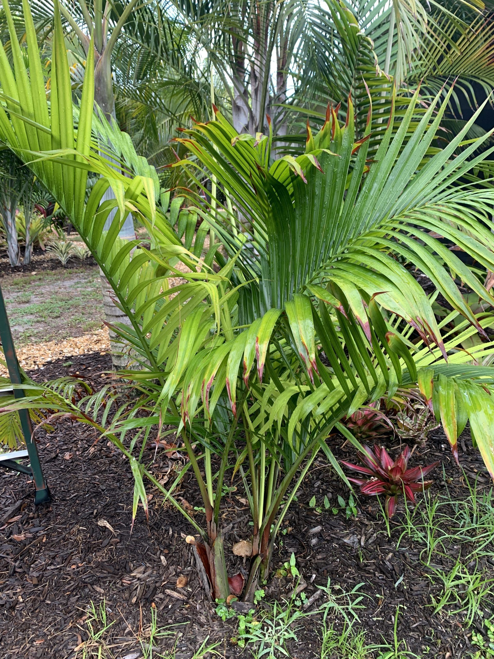 Benefits: Likely going to be our most colorful Dypsis hybrid of all!! Although no mature specimens exist, they should be gorgeous, combining the emerald-green trunk of the Pemba mother with the red, fuzzy crown shaft of the Teddy Bear father with a little bit of white mixed in. There are a few Chrysalidocarpus cabadae x leptocheilos mature specimens in cultivation and this hybrid should look very similar to those.